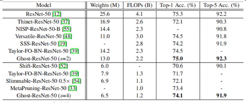 将Ghost模块嵌入到标准的ResNet- 50中,并在ImageNet数据集上进行实验。结果如下表所示,在两倍多加速的情况下,本文的方法可以获得明显更好的性能。当s增加到4时,模型精度下降了0.3%,计算速度提高了4倍左右。相比之下,采用相似权重或FLOPs的比较方法的性能要差得多。