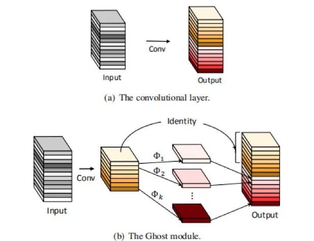 为了降低当前深度神经网络的计算成本,适应移动计算的需求。本文提出了一种新的Ghost模块,用于构建高效的神经网络结构。基本的Ghost模块将原始的卷积分为两部分,首先利用较少的卷积核生成几个固有特征图,在此基础上,进一步应用一定数量的线性变换操作,有效地生成丰富的特征图。