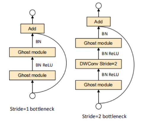 ResNet中的bottleneck结构大家非常了解,作者针对Ghost模块,专门为小卷积构建了bottlenecks。如下图所示,与ResNet中的结构很相似,在Ghost中,bottlenecks主要由两个堆积的Ghost模块构成,第一个Ghost模块的作用是扩展特征图的通道数,我们把输出通道数与输入通道数之比称为扩展比。第二个Ghost模块的作用是减少通道数来匹配捷径路径(shortcut path)。然后将这两个Ghost模块的输入和输出连接起来,除了按照MobileNetV2的建议在第二个Ghost模块之后不使用ReLU外,每一层之后都使用batch归一化(BN)和ReLU进行非线性激活。下图是针对步长为1和2时的结构。当步长为2时,shortcut通过下采样实现,且在两个Ghost模块间插入步长为2的深度卷积。