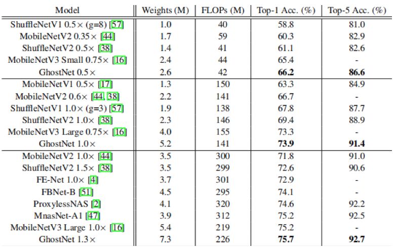 在基准模型和数据集上的实验表明,该方法是一种即插即用的模型压缩方法,可以将原始模型转换为紧凑模型,同时保持可比较的性能。此外,使用新的Ghost模块构建的GhostNet在效率和准确性方面都优于最先进的轻量级神经网络架构。