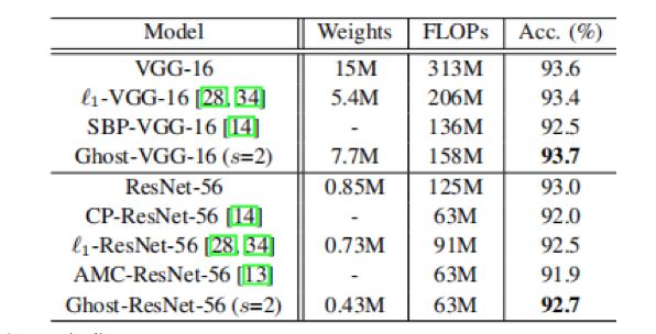 作者将Ghost模块嵌入VGG-16和ResNet-56中,得到新的网络结构,称为Ghost-VGG-16和Ghost-ResNet-56,利用CIFAR-10数据集评估Ghost模块。结构如下图所示,我们将GhostNet与VGG-16和ResNet-56架构中具有代表性的最新模型进行了比较,对于VGG-16,本文模型得到的精度略高于原始的模型且速度快2倍以上,说明VGG模型存在较大的冗余