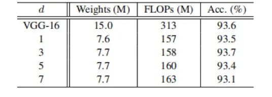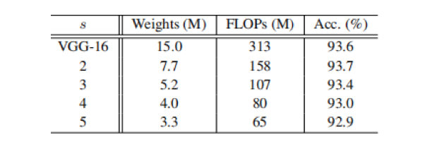 因此,我们在接下来的实验中采用d = 3进行实验。s与得到的网络的计算代价直接相关,s越大,压缩比越大。当我们增加s的时候,FLOPs明显减小,准确率逐渐降低,这与预期一致。特别是当s = 2表示将VGG-16压缩2倍时,本文方法的性能甚至比原模型稍好一些,说明了所提出的Ghost模块的优越性。