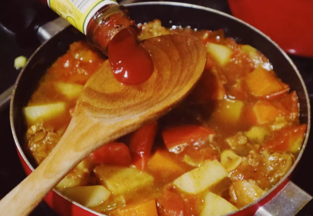 羊腩/牛腩 分量根据各人决定 / 番茄 三个 / 土豆 两个 / 萝卜 一根 / 蒜片 三瓣 / 姜片 五片 / 八角 一粒 / 香叶 两片 / 桂皮 一片 / 葱花 少许 / 生抽 两勺 / 老抽 一勺 / 料酒 两勺 / 冰糖 三粒 / 番茄酱 一勺 / 热水 适量