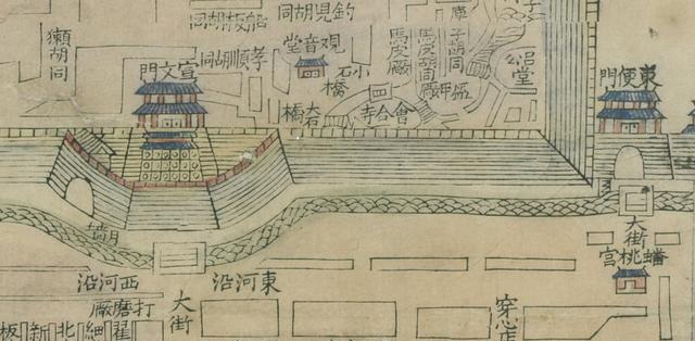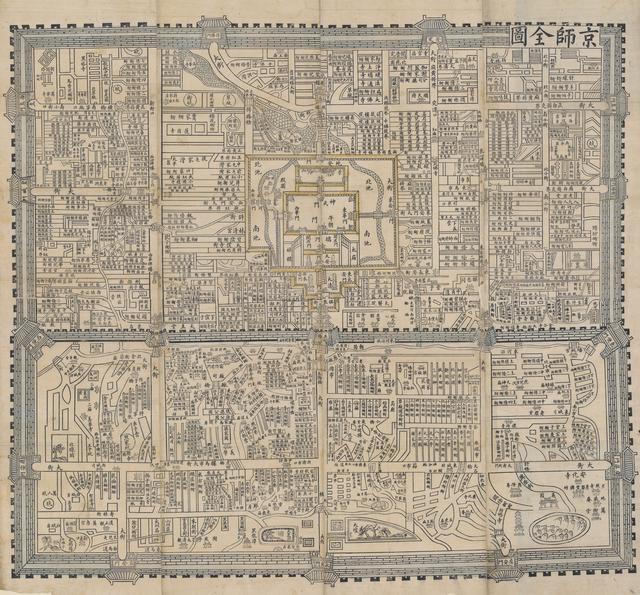 此《京师全图》大致为清乾隆时期淡彩印本(120 x 115 厘米,哈佛大学图书馆藏),未注绘者,详细描绘了北京的街市。