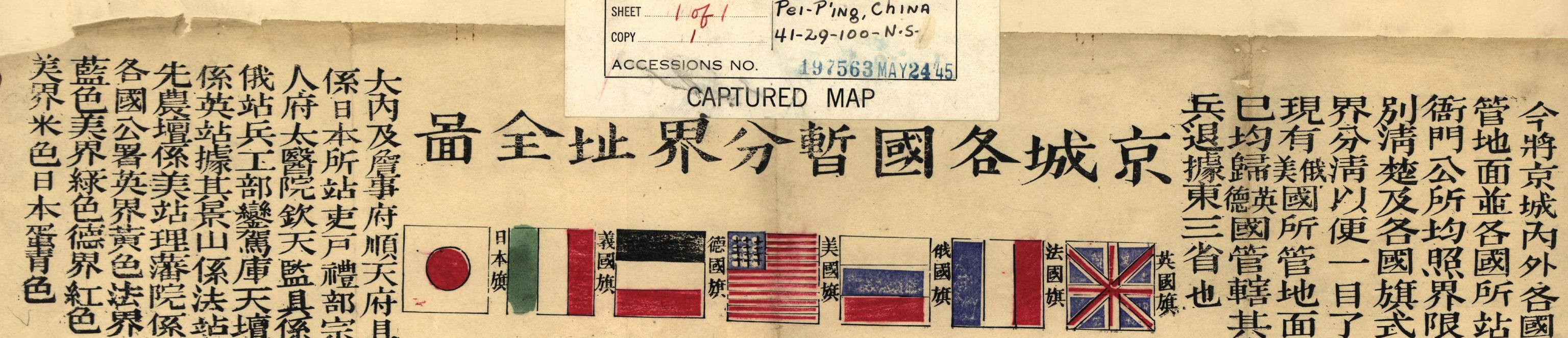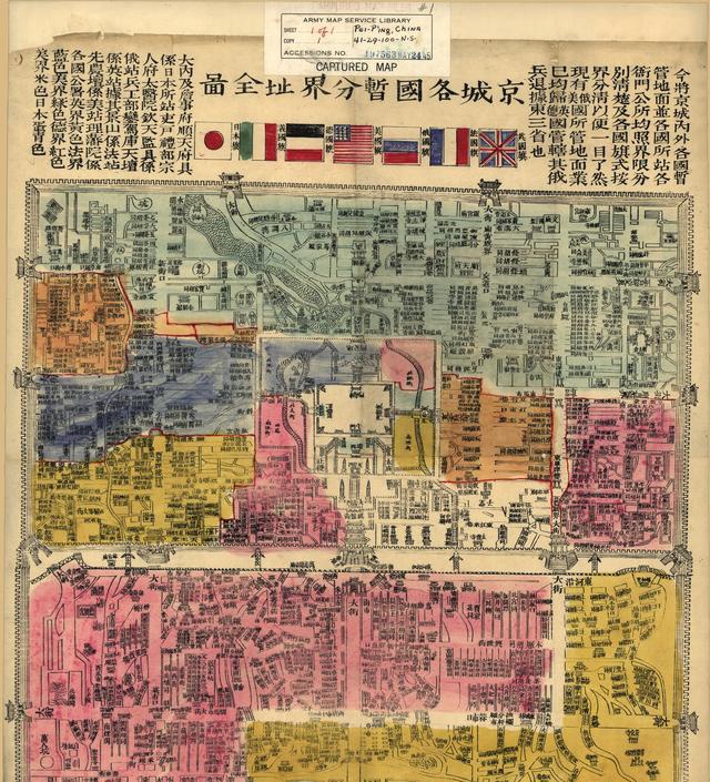 是图为八国联军占领北京时所绘制并设色而成,图中以黄、蓝、绿、红、米、蛋青等颜色区分各国占领区域及各衙门公所。如:“大内及詹事府、顺天府具系日本所站(占),吏、户、礼部、宗人府、太医院、钦天监具系俄站(占),兵、工部、銮驾库、天坛系英站(占)据”等等。