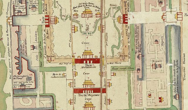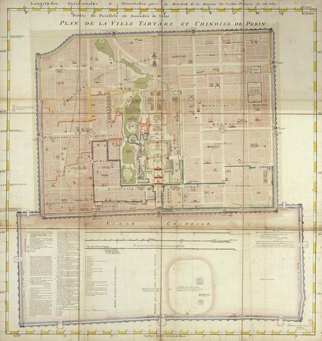 为的是证明紫禁城的午门并不在经线上。由法兰西科学院的天文学者依照法国-葡萄牙教会用天文仪器测定的北京经纬标示,在初图上增加了外城和子午线。