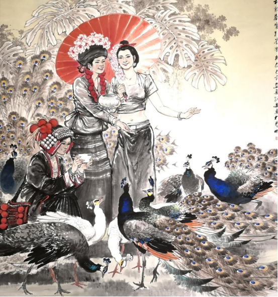 孙建东虽然出生于上海,但是数十年来,受到云南这一块美丽神奇丰沃的红土大地滋养,面对奇美之山水,丰富之植被,艳丽之花卉,将其情思从纷繁、浓烈的笔端泻出,无不对这样的一山一水一树一石一鸟充满感情。老庄之道在于自然应顺其法则,在傣族人民的心目中,孔雀是最善良、最聪明、最爱自由与和平的鸟,是吉祥幸福的象征。而孙建东默契于自然,架构人与自然的和谐,所以画幅中潜存着一层对自然深深的敬畏之情。他着力于发掘和平、瑰丽而明净的花鸟天地,开辟自己流畅、重彩的笔墨性格。他笔下的孔雀,曼妙舞动,风姿绰约,宛如符号。他遵循袁晓岑先生开启的描绘野生孔雀先河,将孔雀的华贵与野逸和谐统一。孙建东有不少作品将孔雀置身于西双版纳的林泉之中,让人领略大自然里的孔雀的清新、幽雅、出尘,远非配以牡丹、桃花、杏花等庭园孔雀可以比拟。牠们或悠然地涉于叮咚有声溪涧流泉之中,或金瓴翠羽闪烁于薄雾晨纱中,或伴着垂下的曲折盘桓古藤浓荫处栖息,或在奇崛古朴的苍岩怪石间小憩。自然环境中的孔雀形象具有矫健、潇洒、自然之美,从而构成了兼有灵性和野趣的意境,汇成了大自然生命葱茏絪缊的交响,也是画家钟情于大自然的真实感情的写照,比如他的《雨林风情》、《雨林恋歌》、《野林清哓》、《孔雀乐园》和《宁静的家园》。