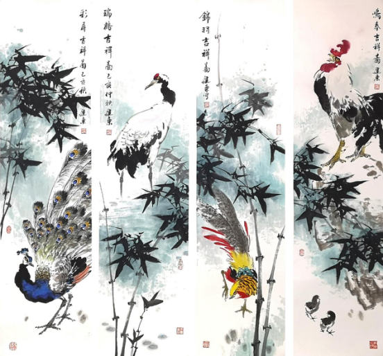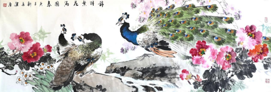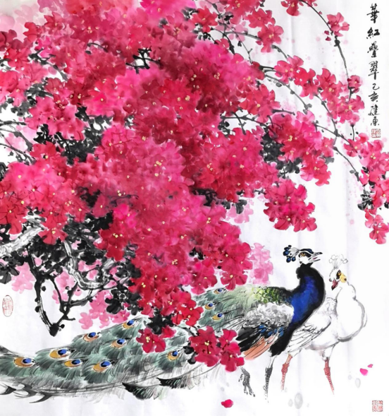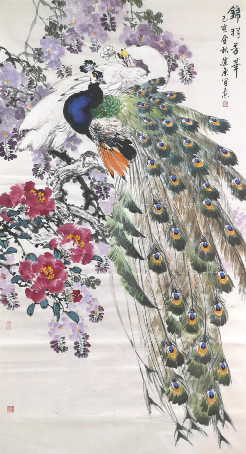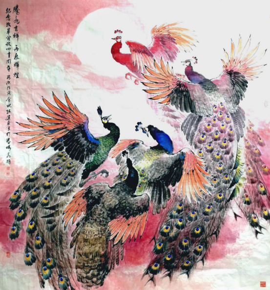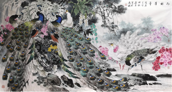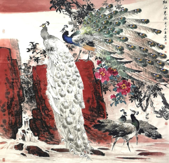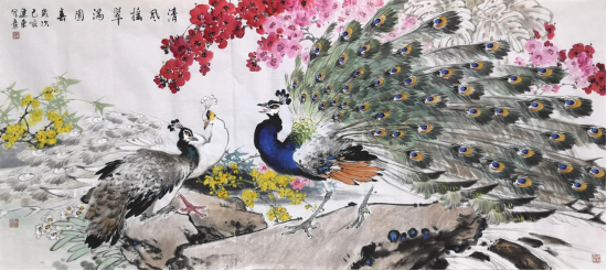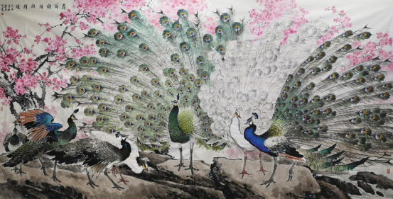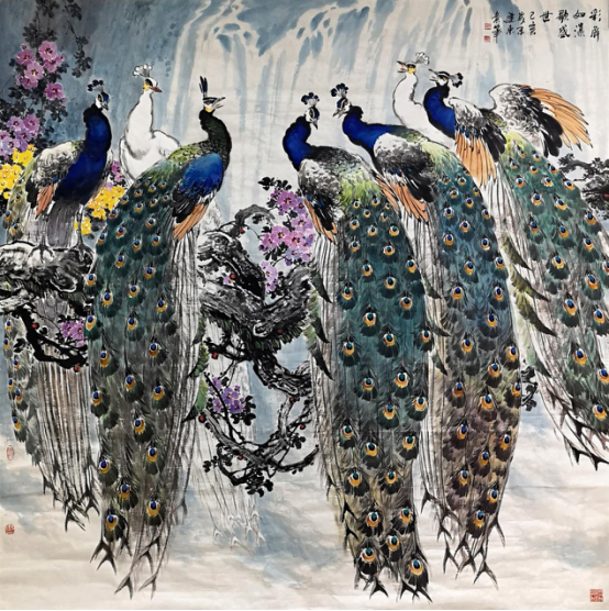 孔雀气质高贵,举止脱俗。惟有孔雀,集“九德”于一体,其他禽鸟难与其相比。孔雀分为白、金、蓝、绿四色,孔雀美丽,羽毛却错综复杂,是历代花鸟画家追求而难以表达完美的。孙建东笔下大多是蓝孔雀,颈部和胸部均为蓝色,华贵高雅,而最精彩的地方之一是蓝孔雀的脖子,用浓墨破笔,然后用厚重的石青、孔雀蓝等点在颈部中间,使墨色有虚实变化,由重渐轻,过渡自然,并留下小片白色,恰似孔雀脖子在阳光下折射的光泽,灼灼耀目。这可见他的作品《清荫环翠》、《绿野春酣》。他以工兼写,色与墨结合,纷繁、浓烈、绮丽的笔墨,因孔雀曼舞而熠熠生动,华奕照耀,心目之所及,充满着生命动感,呼之欲出。这在《灿烂光华》和《瑶林清晖》等作品中表现得尤为突出。