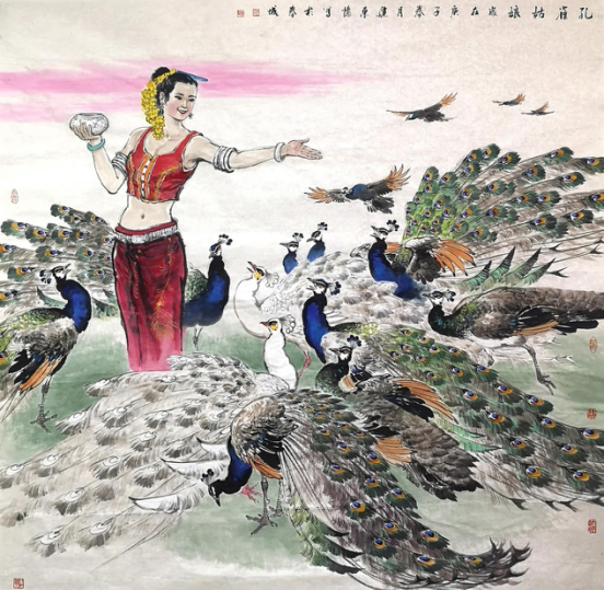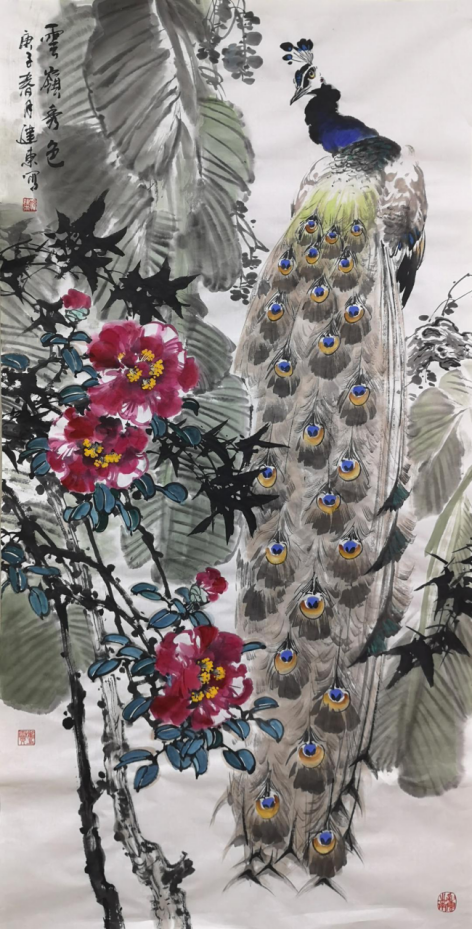 孔雀是一种超凡脱俗的灵性之鸟,孔雀之舞让人置于一种尽显灵气往来的空间。如果把孔雀之舞的绽放艺术地染在画面上,便显示出一种华丽繁富的美,斑纹绚烂的艳,以及笔墨间流露出的人的性灵。物象呈现着的灵魂生命,艺术家经过造型、传神到妙悟,步步升华,直到美感诞生之时。孙建东的一批孔雀题材画作,既承传了他老师袁晓岑当代写意孔雀画的造诣,充溢着生命的生动和韵律,又汲取了大自然的造化之师。锲而不舍,长期磨练,努力以笔墨色彩,面对客观物象追求自己的个性面貌。