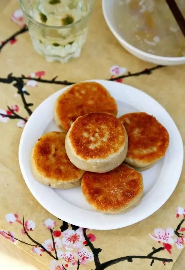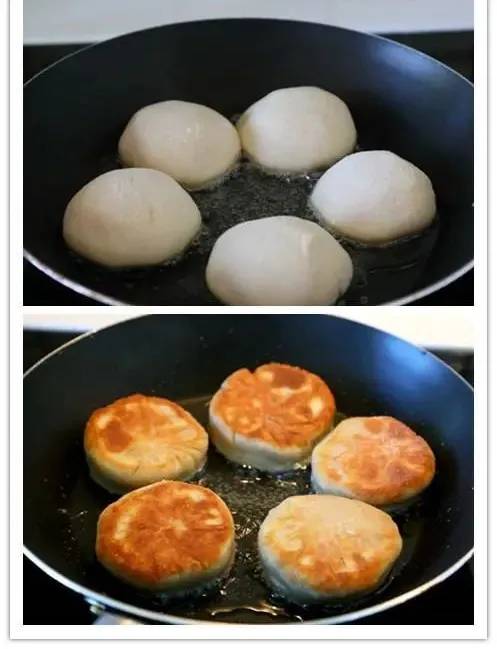 1.锅烧热倒油(油要稍微多些),油温热时,将饼坯封口向下放入锅中(饼入锅前再整整形,因为面特别软),盖上锅盖用小火煎。