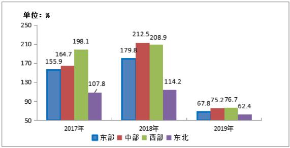 2014-2019年东、中、西、东北地区移动互联网接入流量增速情况