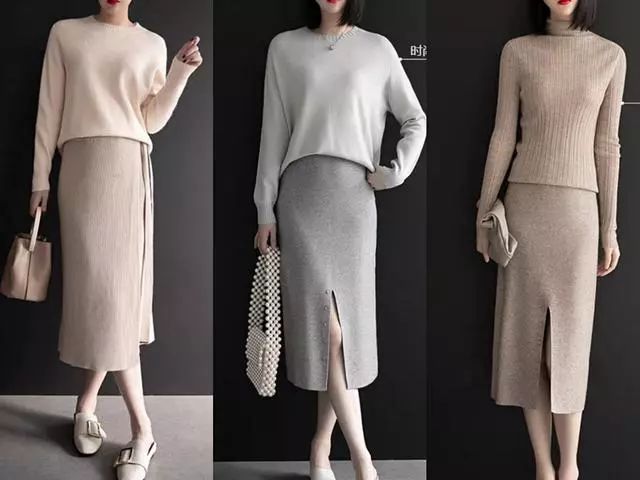 毛呢裙是个人比较喜欢的裙装,其中直筒的裙型最能体现出女性的曲线美与知性气质来,特别适合职场女生。暖灰色针织衫搭配浅灰色毛呢裙,简约雅致,前开叉的裙型可以露出女人优美的腿部侧线,很美。