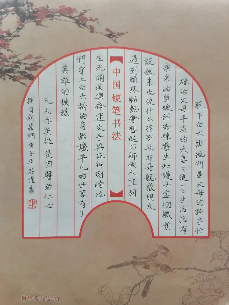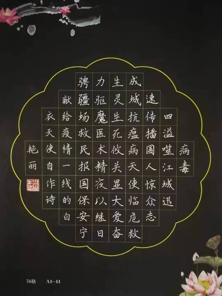 在疫情肆虐的日子里,我们这些参赛者用一杆硬笔抒发情怀,为救灾的医护人员鼓气为武汉加油!好诗配好字,每幅作品都是千丝万缕的线条汇聚而成,好似跳动的音符五线谱,为医护人员救死扶伤的精神讴歌!