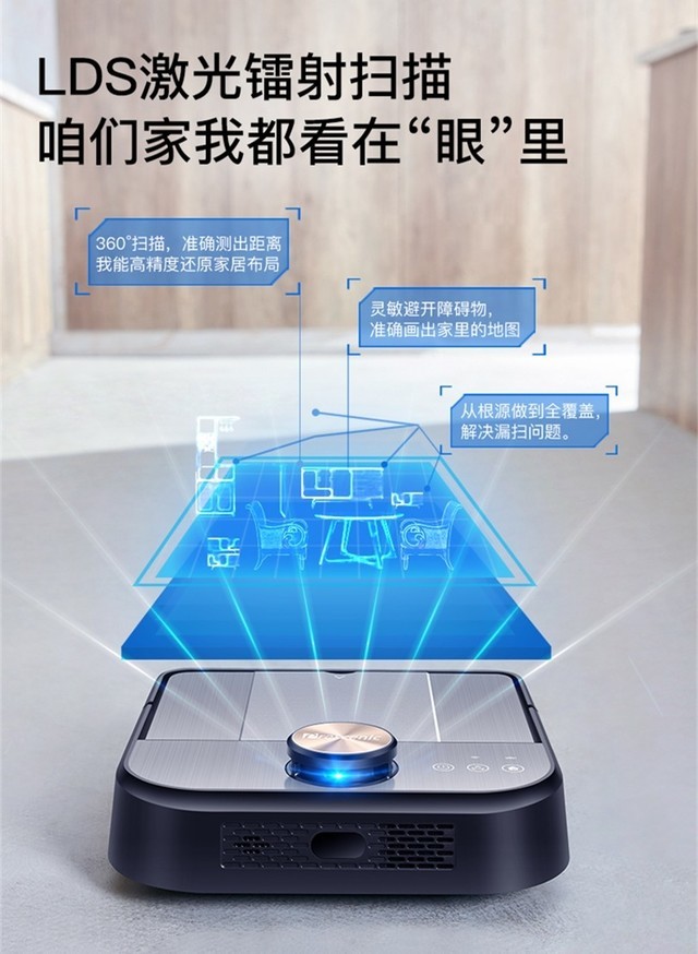 在导航方面,浦桑尼克扫地机器人LDSD550同样搭载了LDS激光镭射技术对周围环境进行扫描,拥有360度的无死角检测广度,可以准确测出距离,灵敏避开障碍物并高精度还原家居布局,画出家里的地图,从而从根源上做到全覆盖,解决漏扫问题,还避免了扫地机横冲直撞导致损坏机身和家居物品的损坏。