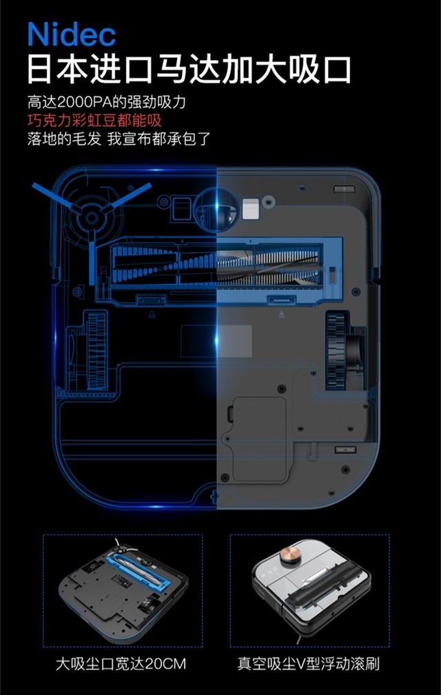 采用Nidec日本进口马达加大吸口,高达2000PA的强劲吸力,搭配真空吸尘V型浮动滚刷,无论是尘土、碎屑还是毛发都能搞定,连巧克力彩虹豆都能吸。