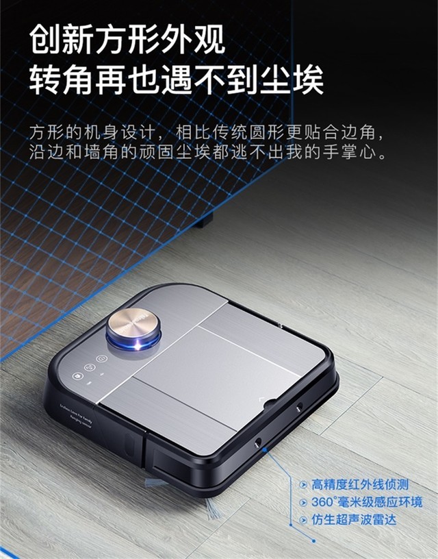 为了更好的清洁死角,浦桑尼克扫地机器人LDSD550采用了创新性的方形外观设计,相对于传统圆形扫地机,对于房间墙角和边角的贴合度更高,能更好的贴合边角清扫,从而达到高效清洁的目的。