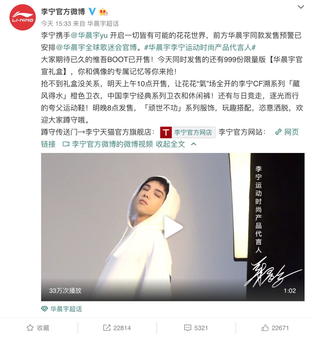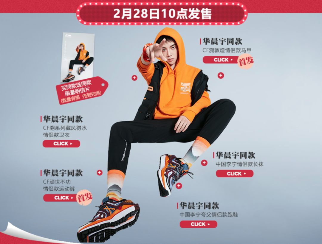 那么,回到此次李宁签约华晨宇成为代言人的营销事件, 「让消费者更快抓准李宁运动时尚的产品定位」或者「吸引千禧一代粉丝们的注意」等等积极意义自不必多言。 如果认真研究一下李宁此次对于代言合作的宣传手段,就不难发现,李宁这次品宣的重点,或者说他们真正寄望华晨宇能发光发热的,就是他「明星带货」能力。