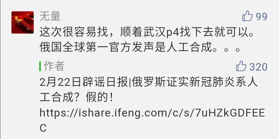 前些天,有人造谣说,俄罗斯“确证”了这是人工合成的病毒,还由卫生部长签字上交国际卫生组织云云。