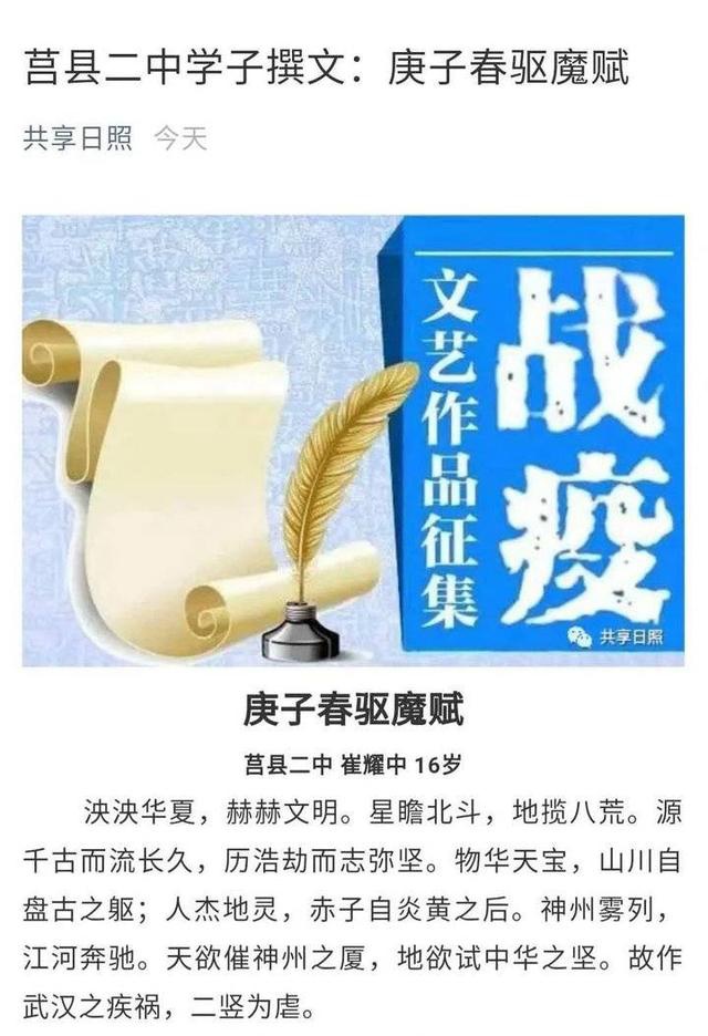 莒县二中高二(2)班崔耀中同学,诚心忧国,悲悯苍生,写下《庚子春驱魔赋》。全文句式错落,辞藻华丽而不浮躁,引经据典,饱含真情,一气呵成。以“赋”这一较难掌握的文体,讴歌抗战在一线的平凡英雄;咏叹全国人民上下一心,同舟共济;祈愿阴霾散去,重振巍巍中华。