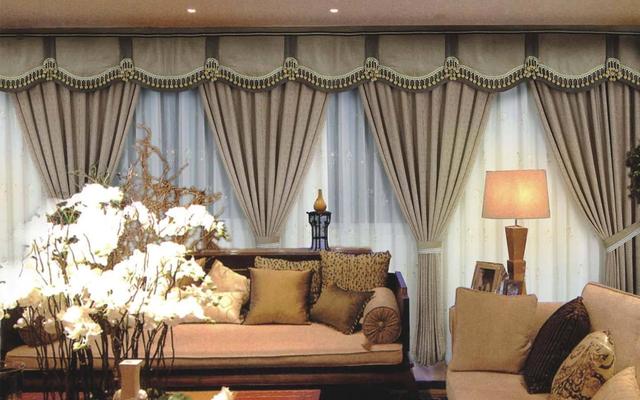 这种帘头设计适合多扇窗户组合在一起的情况,多重褶皱的帘头自然垂下,感觉优雅,这种帘头适合选用有垂坠感的面料。