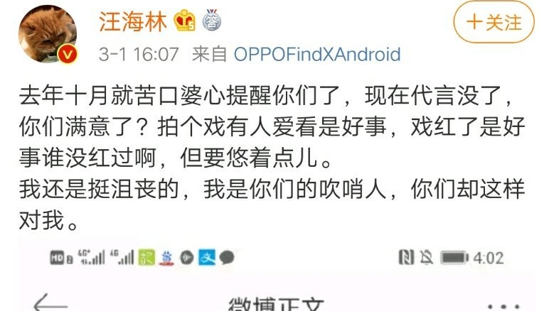 3月1日汪海林又在微博发文称:去年10月就苦口婆心地提醒你们了,现在代言没了,你们玩满意了,拍个戏有人看是好事,戏红了是好事儿,谁没红过呀?但是要悠着点儿。我还是挺沮丧的,我是你们的吹哨人,你们却这样对我。作家刘某某认为汪海林是吹牛人,不伦不类,没有资格对肖战指手画脚。