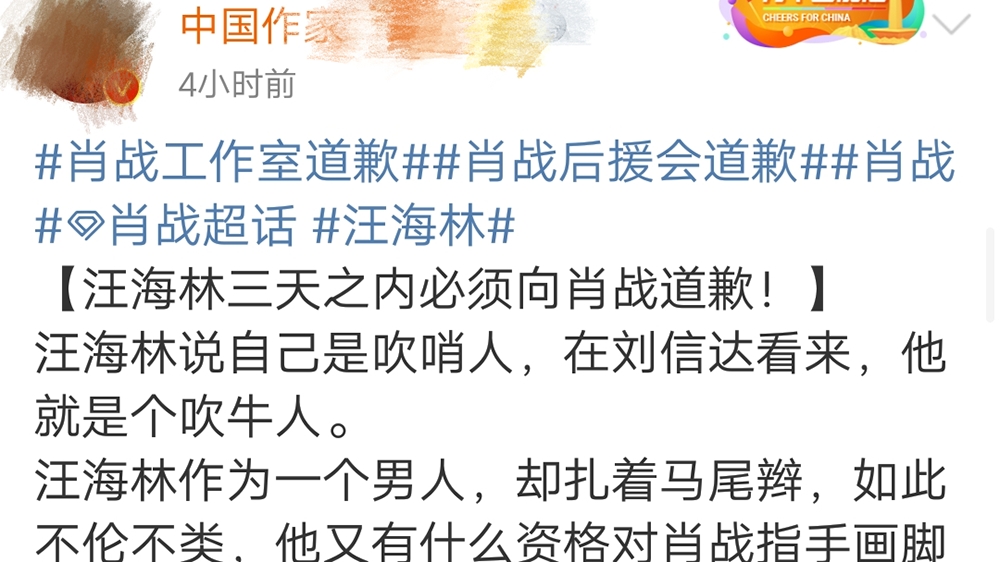 近日,中国著名作家刘某某在微博上发文称:汪海林三天之内必须向肖战道歉,汪海林说自己是吹哨人,在刘某某看来,就是一个吹牛人,汪海林身为一个男人却扎着马尾辫,如此不伦不类,他又有什么资格对肖战指手画脚的?