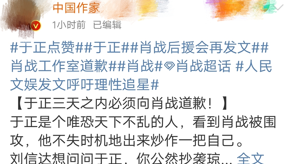 接着这位中国作家又在微博上发文称:于正三天之内必须向肖战道歉,于正是个唯恐天下不乱的人,看到肖战被围攻,他不失时机的出来炒作自己,刘某某想问问于正,你公然抄袭琼瑶行为如此不正,你又有什么资格对肖战指指点点的?