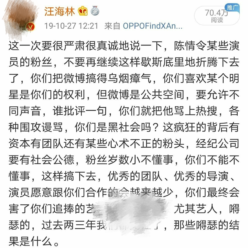 肖战风波发生之前著名编剧汪海林曾经在19年在微博上发文称:这次要很严肃,很真诚的说一下陈情令某些演员的粉丝不要再继续这样歇斯底里的折腾下去了,你们把微博搞得乌烟瘴气,你们喜欢某个明星是你们的权利,但微博是公共空间,要允许不同声音,谁批评一句你们就把他骂上热搜......经纪公司要有社会公德,粉丝岁数小不懂事,你们不能不懂事,这样搞下去,优秀的团队,优秀的导演,演员跟你们合作也会越来越少,你们会最终会害了你们追捧的艺人。这个行业,尤其是艺人得瑟的过去两三年,我们都见证了,那些得瑟的结果是什么。
