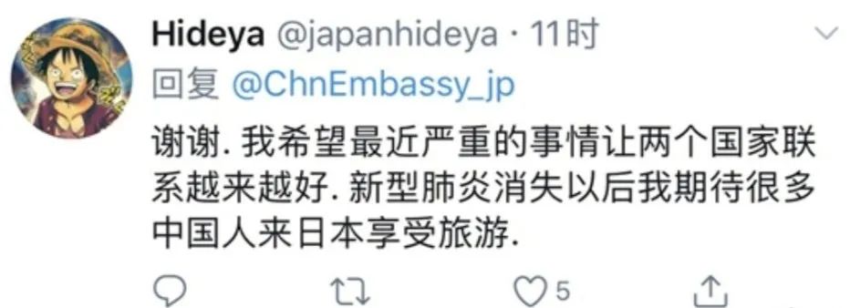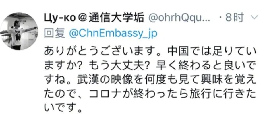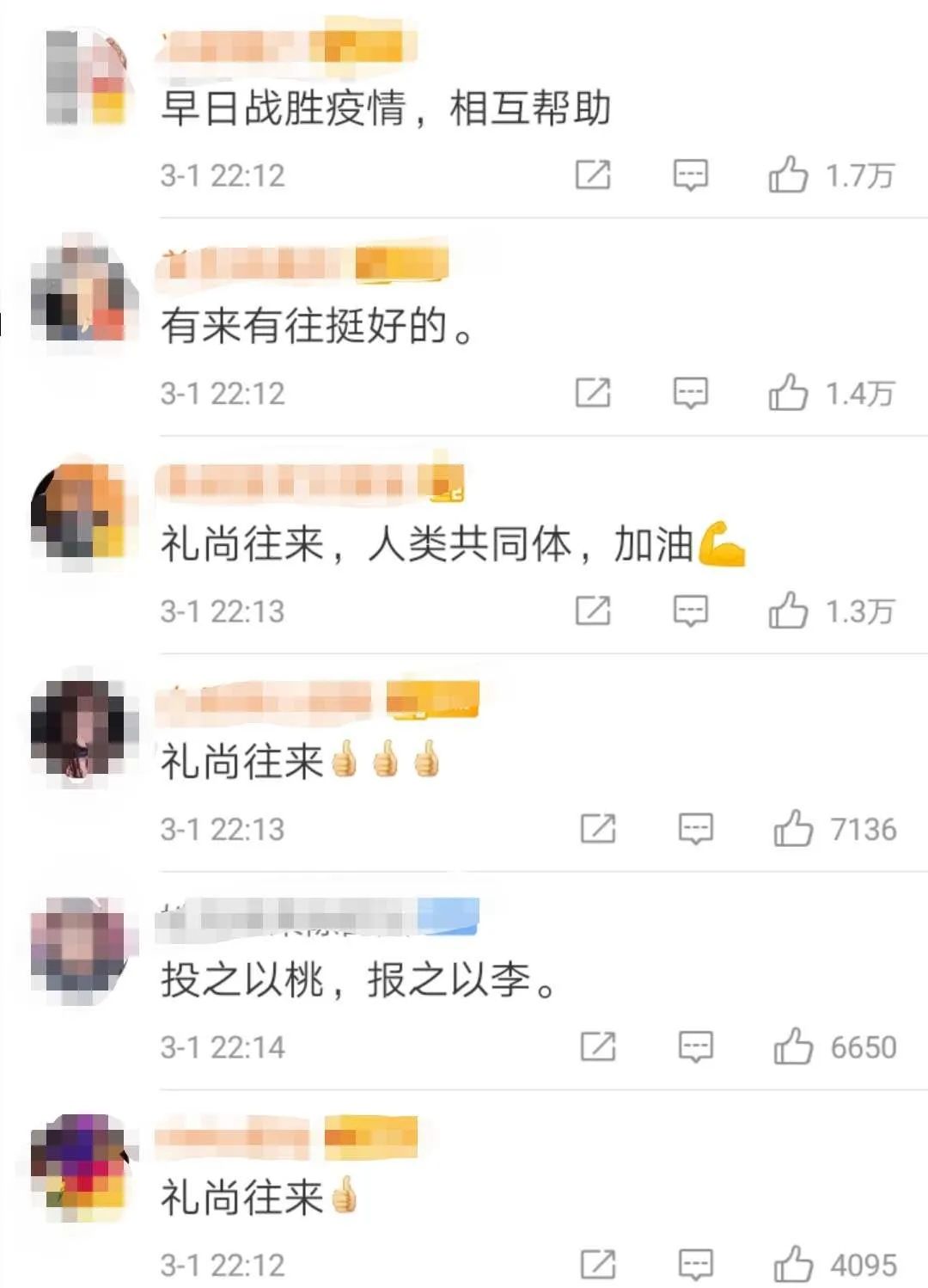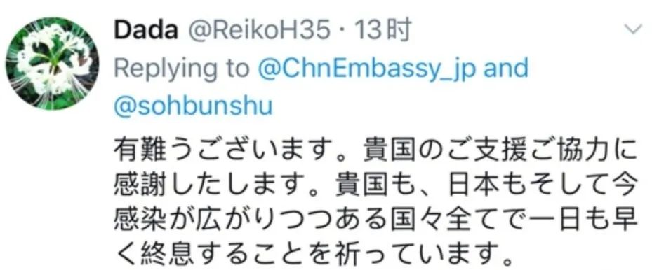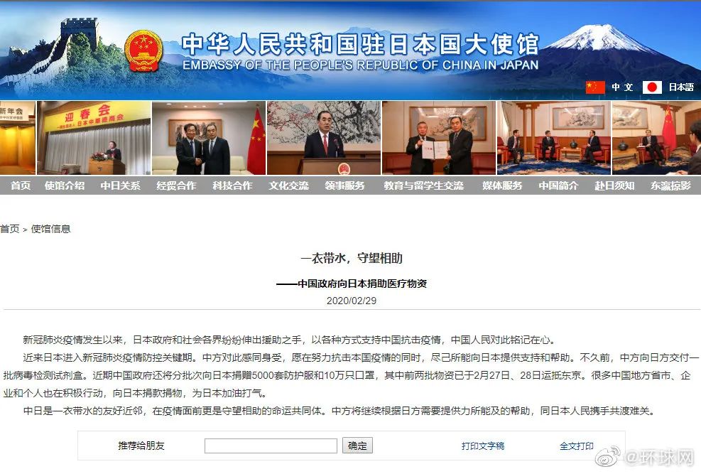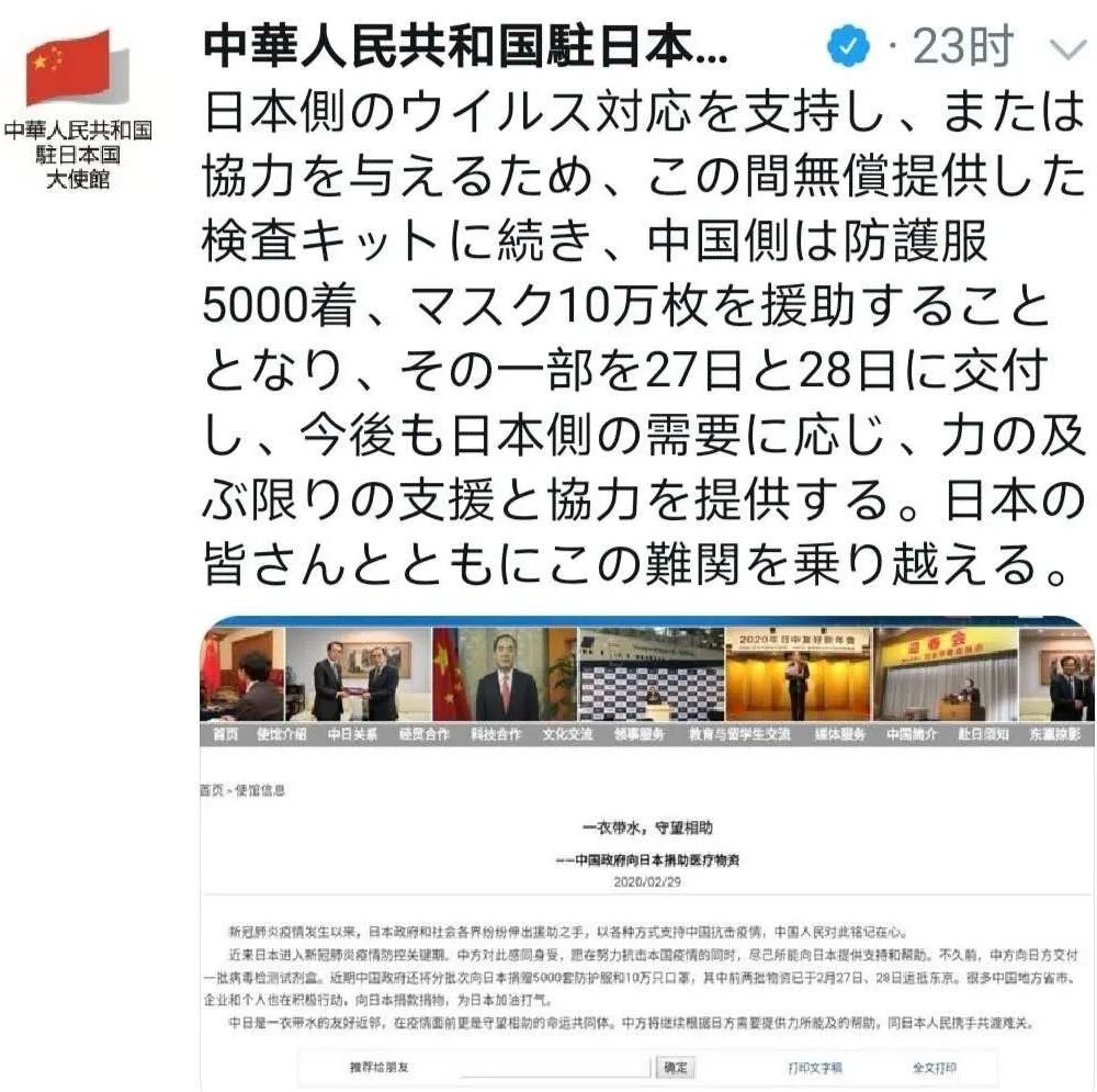 3月1日,中国驻日本大使馆官方推特发布了关于中国向日本捐赠抗疫物资的推文。