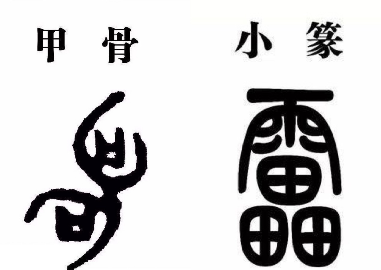 “雷”字,其甲骨文形体本来指的是火球,也就是闪电中夹杂的火球,圆圈和小点表示雷声,表示雷声和闪电相伴而作。小篆则变成了会意字,从雨,下象雷声相连之形,意喻打雷下雨。《说文》曰:“雷霆余声钤钤,所以挺出万物也”。