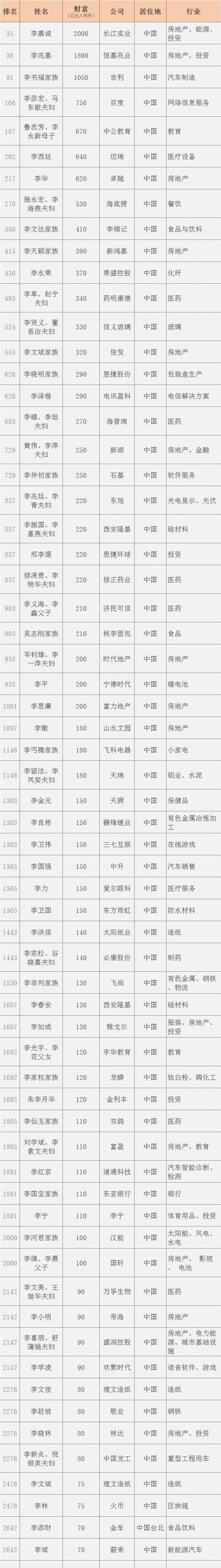 此外,李氏家族还有百度的李彦宏、马东敏夫妇,中公教育的鲁忠芳、李永新母子,迈瑞的李西廷,卓越的李华,海底捞的施永宏、李海燕夫妇,李锦记的李文达家族,新鸿基的李天颖家族,荣盛控股的李水荣等等宗亲入选“2020胡润全球富豪榜”。