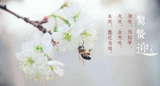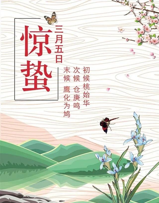 惊蛰的三候说法为:第一侯,桃始华。第二侯,仓庚鸣。第三侯,鹰化为鸠。描述已是桃花红、李花白,黄莺鸣叫、燕飞来的时节,大部分地区都已进入了春耕。惊醒了蛰伏在泥土中冬眠的各种昆虫的时候,此时过冬的虫卵也要开始卵化,由此可见惊蛰是反映自然物候现象的一个节气。“春雷响,万物长”,惊蛰时节正是大好的“九九”艳阳天,气温回升,雨水增多。这个时候我们从冬至而来的“九九消寒图”也就大功告成了。