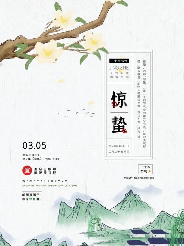 惊蛰是一年中的第三个节气,在公历的3月5日或6日到来。动物蛰藏入土冬眠叫入蛰,春雷乍响,冬眠于地下的虫子受到地气的影响和炸雷的惊吓从而从土中钻出,开始了新的生命过程。惊蛰,二月节。《夏小正》曰:正月启蛰,言发蛰也。万物出乎震,震为雷,故曰惊蛰。是蛰虫惊而出走矣。