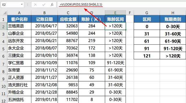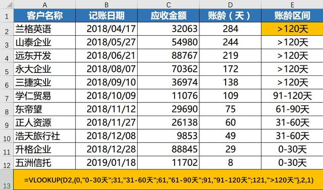 =LOOKUP(D2,{0;31;61;91;121},{"0-30天";"31-60天";"61-90天";"91-120天";">120天"})