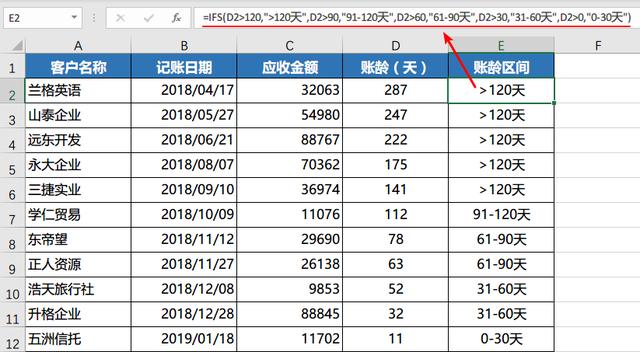 =IFS(D2>120,">120天",D2>90,"91-120天",D2>60,"61-90天",D2>30,"31-60天",D2>0,"0-30天")