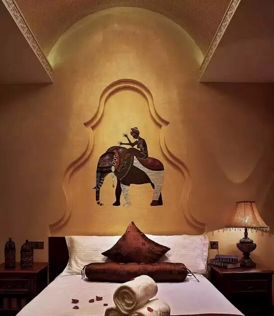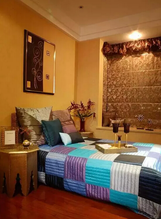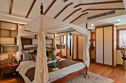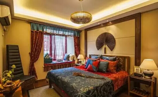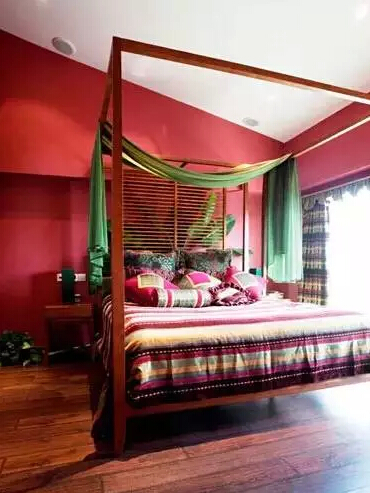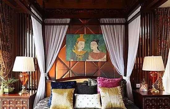东南亚风格在配色上及其大胆,香艳浓烈的色彩被运用在布艺家具上,如床帏处的帐幕、窗台的纱幔等。在营造出华美绚丽的风格的同时,也增添了丝丝妩媚柔和的气息。
