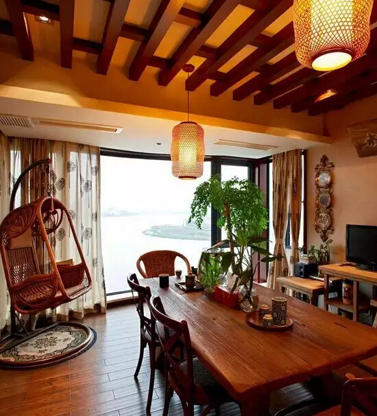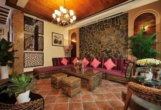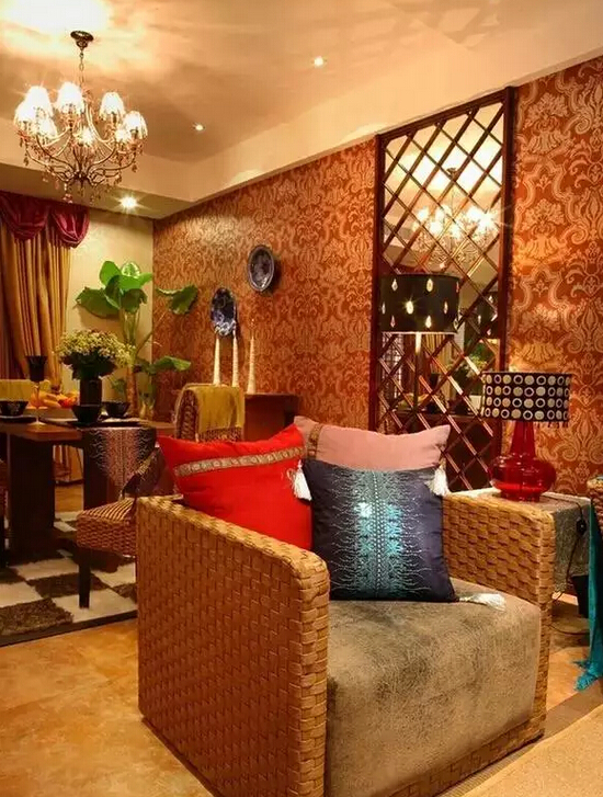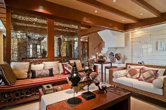 东南亚家居设计崇尚自然,木材、藤、竹成为室内首选。家具上多就地取材,注重手工性,有利于创造个性化空间。古朴的藤艺家具、配衬蓊郁的绿化,是常见的用来表现东南亚风格的手法。