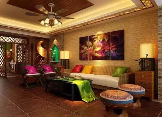 在布艺色调的选用,东南亚风情标志性的炫色系列多为深色系,在光线会变色,沉稳中透着点贵气当然,搭配也有些很简单的原则,深色的家具适宜搭配色彩鲜艳的装饰。