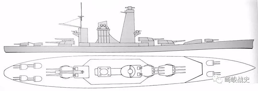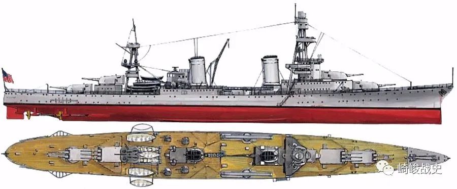 ■美国海军彭萨科拉级重巡洋舰的侧视及俯视图,其主炮布局与平贺案相同。