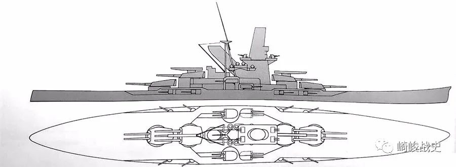 ■美国海军“北卡罗来纳”号战列舰。从北卡罗来纳级到衣阿华级,美国海军各级战列舰均采用与藤本案相同的主炮布局。