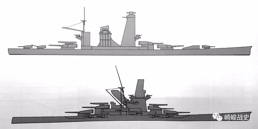 ■“金刚代舰”案中藤本案(上)与平贺案(下)的侧视线图对比。