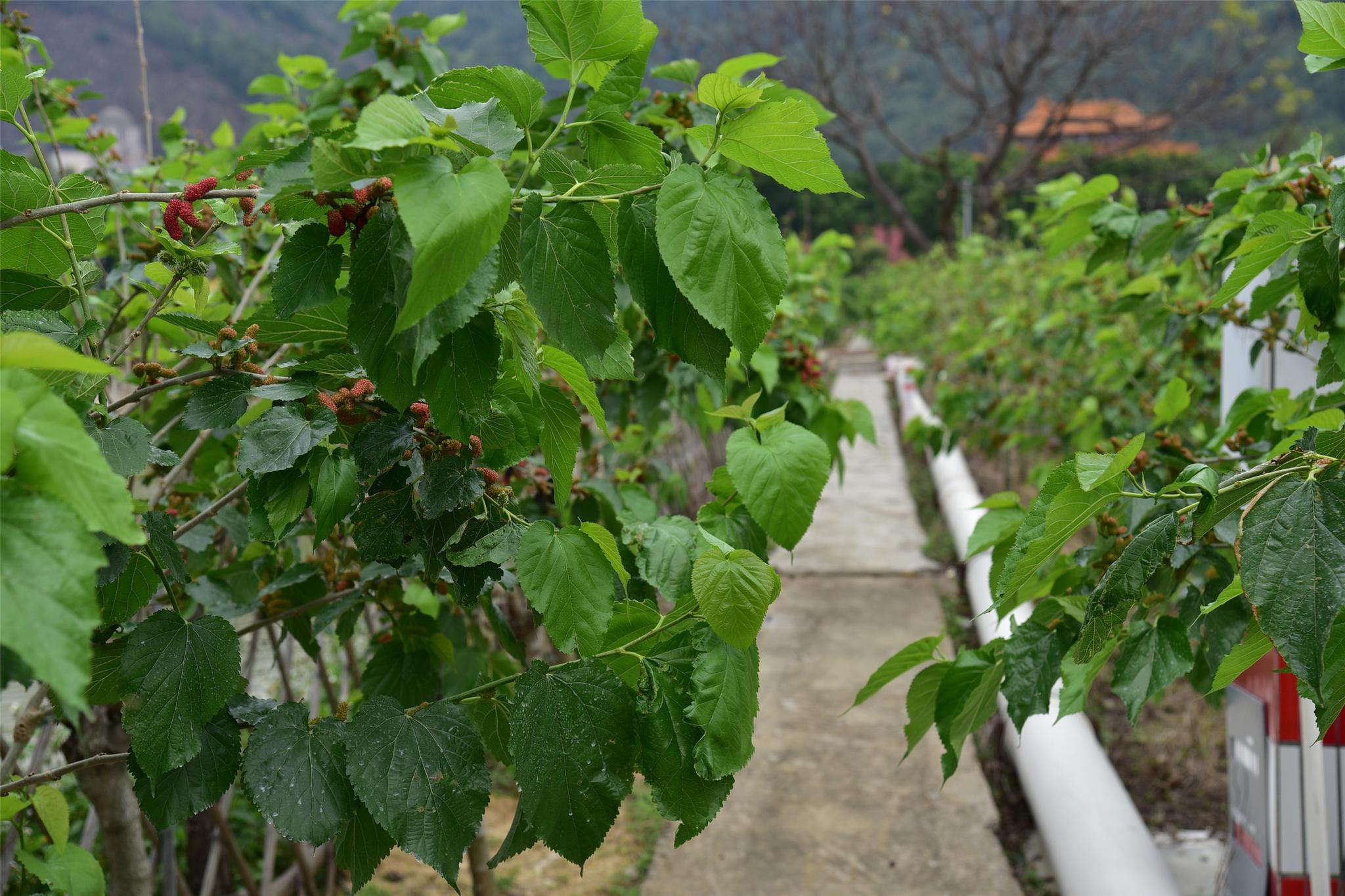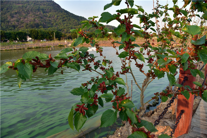 园区种植了上万株桑树,桑树结出一树硕果,丰姿绰约,饱满肥美,果香扑鼻。桑葚果被医学界誉为“21世纪的最佳保健果品”。摘一棵熟透的桑葚,丢一个进嘴里,稍一咬,那种惬意的香甜流遍全身。