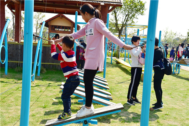 绿茵茵的草地上,游客们可以与孩子玩碰碰球、骑毛毛虫、丢手绢、老鹰捉鸡等各种游戏,一家人乐翻天。拓展园里,30多项水上拓展项目,挑战游客的意志与毅力。