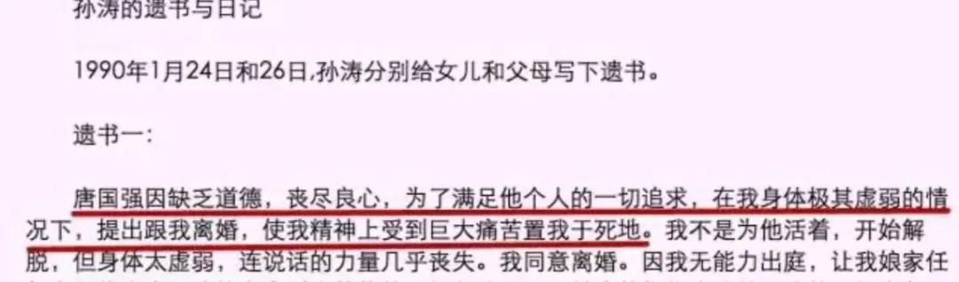 但孙涛的母亲却并不认同这一点,她在2004年的记者采访中提到女儿的死跟唐国强脱不了关系,女儿发现了唐国强和壮丽的不正当关系后深受打击,唐国强用甜言蜜语哄得了孙涛的原谅,但孙涛病倒后,唐国强却选择了搬离家中,徒留脆弱的孙涛。