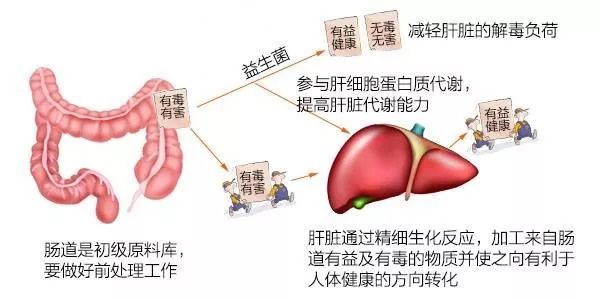 当肠道菌群中的益生菌,如双歧杆菌产生维生素B族等参与肝细胞的蛋白质代谢,帮助提高肝脏的代谢能力。同时肠道有益菌通过其酸性代谢产物还可降低肠道氨的产生,并可利用氨作为氮源,减轻肝脏的解毒负荷,这在肝功能受损的患者尤其有利。 所以有益的肠道菌群一方面产生有益物质帮助肝脏工作,一方面在肠道中将有害物质分解掉减轻肝脏负担,从而达到保护肝脏的目的。反之,如果肠道菌群失调,就会进入恶性循环了。