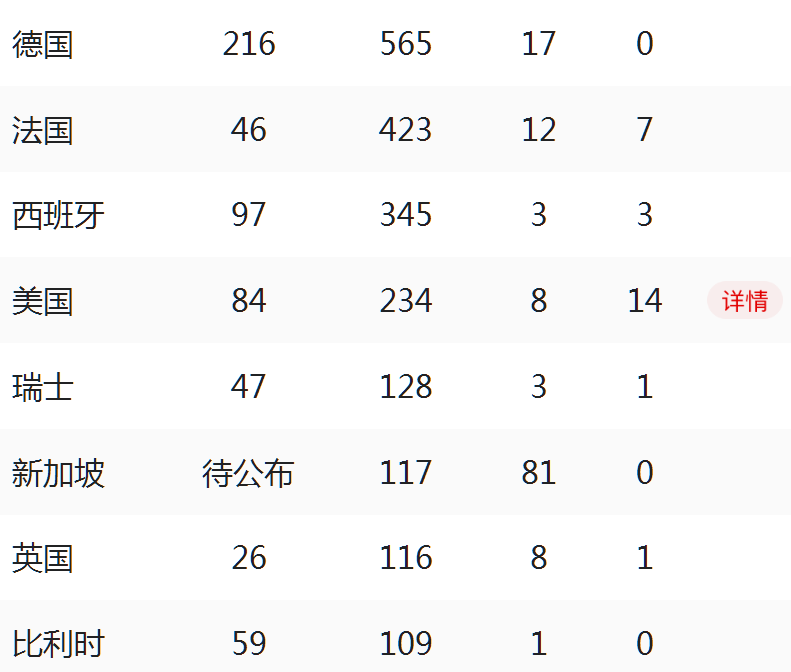 接下来是法国、西班牙这两个紧邻意大利的欧洲大国,分别是423例、345例。