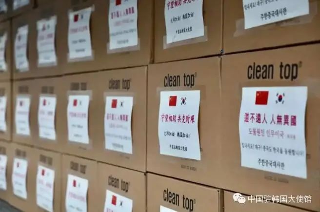 中国为韩国筹备的医用物资,贴着新罗旅唐学者崔致远“道不远人、人无异国”的诗句