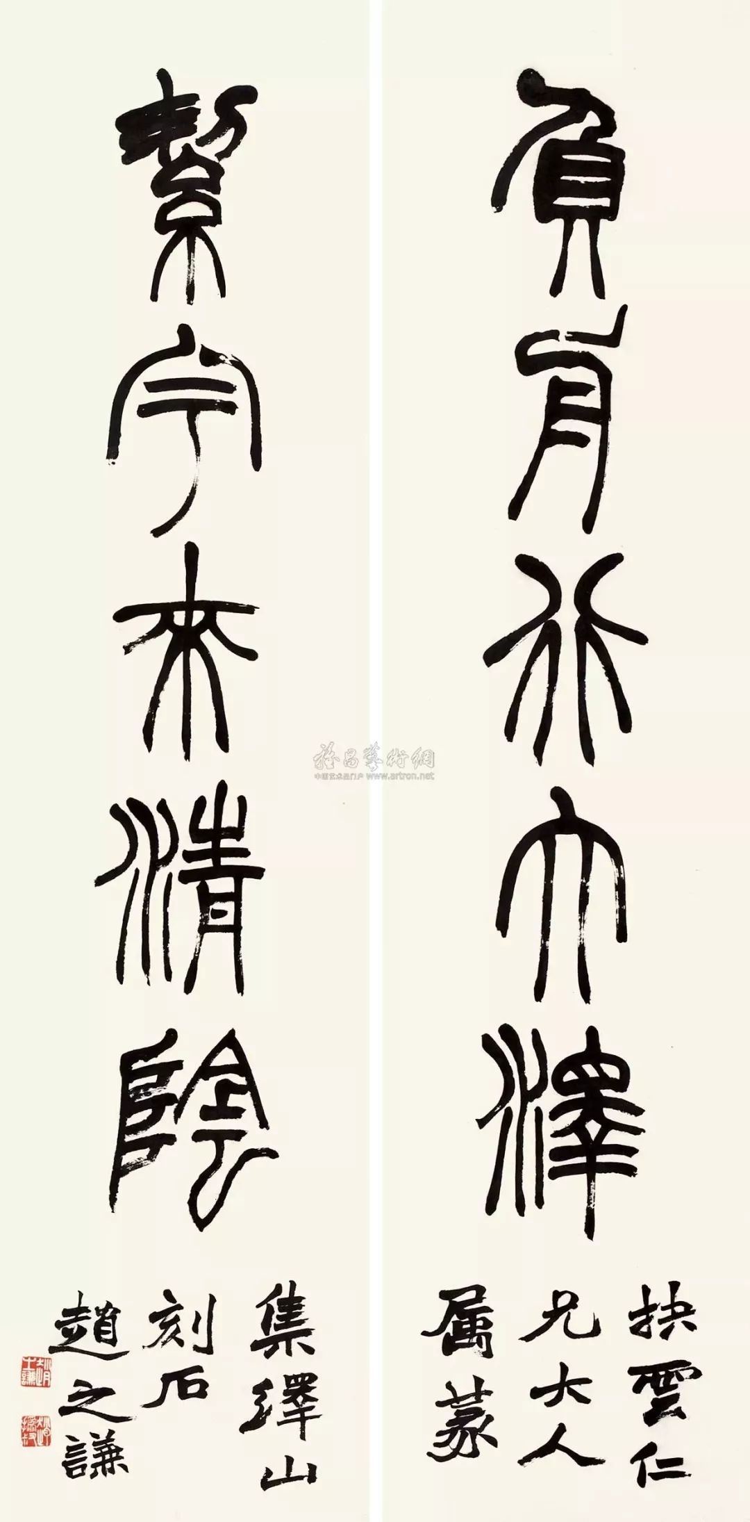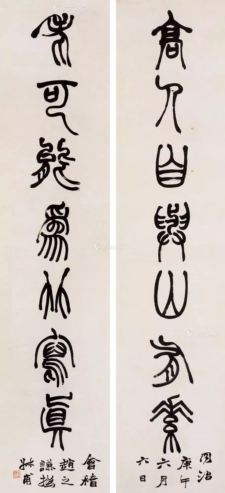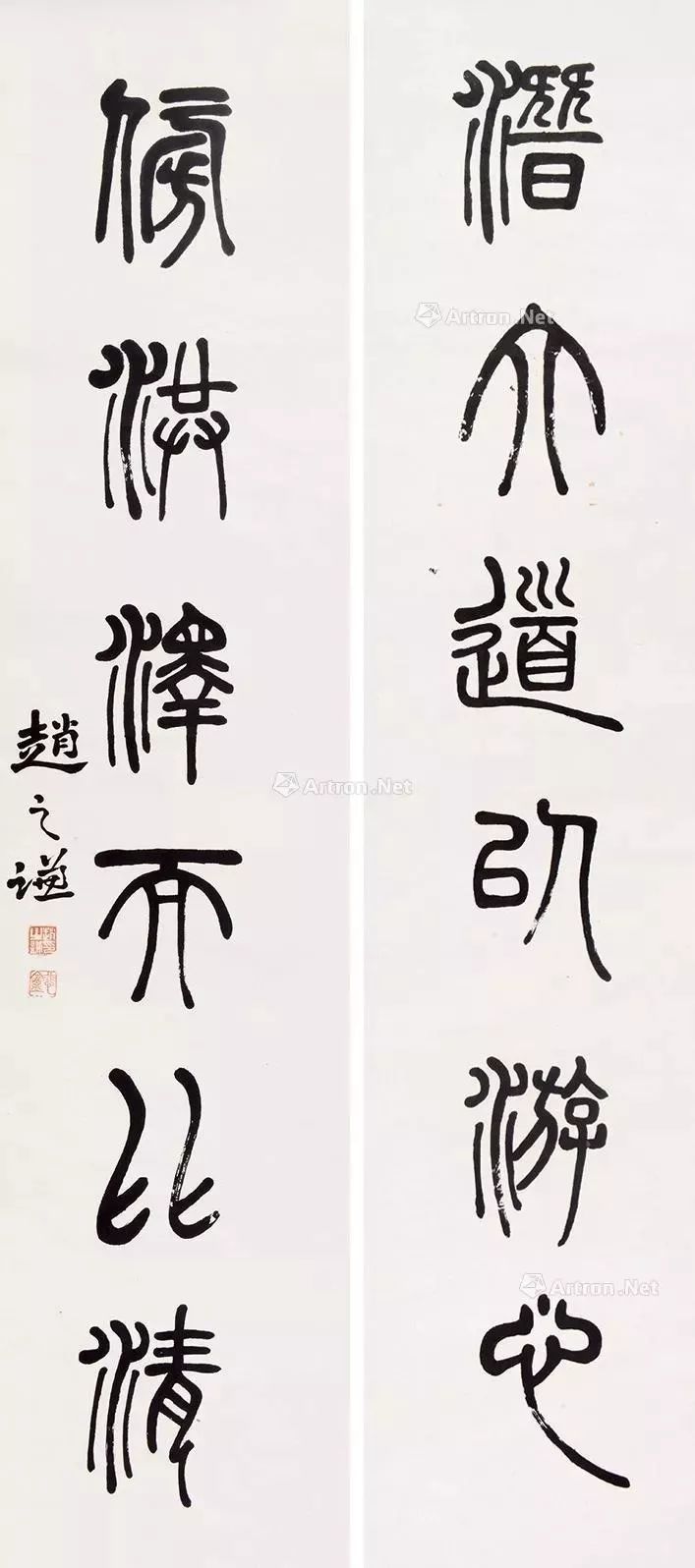 此联是其将结构美化到了一个极致,一改秦、唐篆法的严正端庄,并在邓石如、吴让之、胡澍之外,别出新意。每一结字,每一点画,都有一种流动之美,圆转流畅,若轻歌曼舞,飘举顾盼,风神俊美。圆转而绰约,妩媚而优雅,整体看,则气脉连贯,郁茂之气欲出,是为佳作。