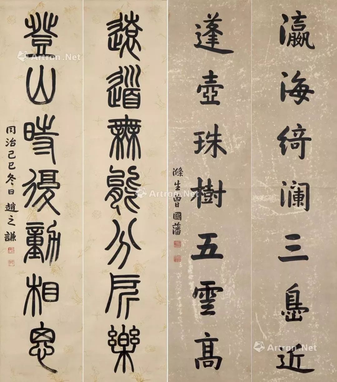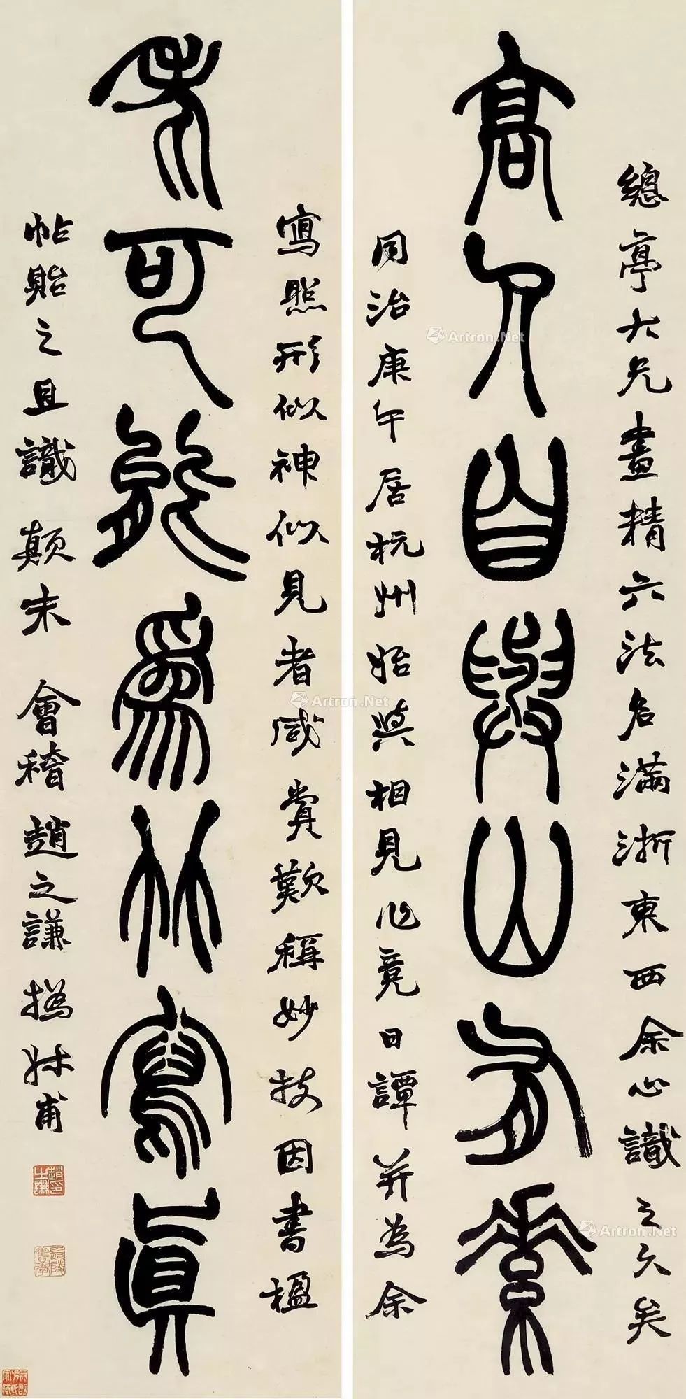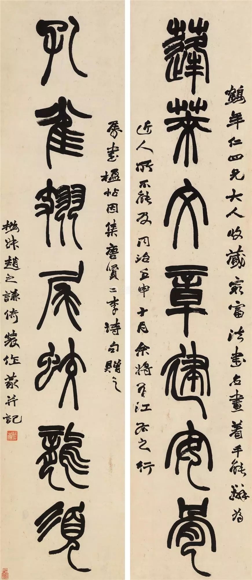 题识:蓬莱文章建安骨,孔雀翅尾蛟龙须。鹤年仁四兄大人收藏穷富法书名画,着手能辨,为近人所不能及。同治壬申十月,余将有江右之行,属书楹帖,因集唐贤二李诗句赠之。撝叔赵之谦倚装作篆并记。
