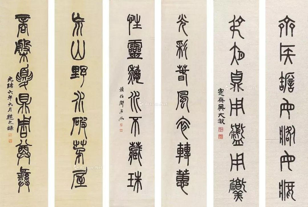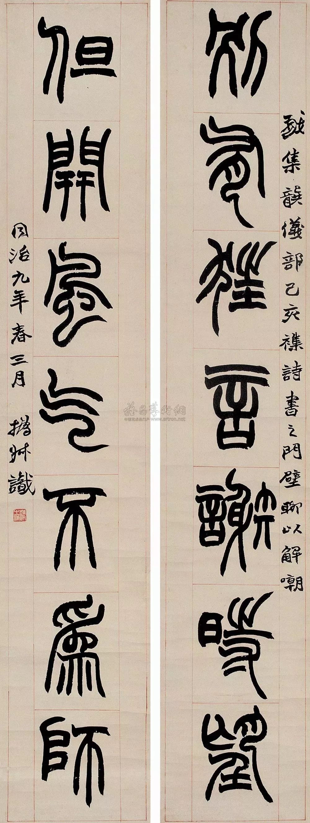 篆书五言联 作于1867年 182.9 x 48.3 cm 美国纽约大都会博物馆藏